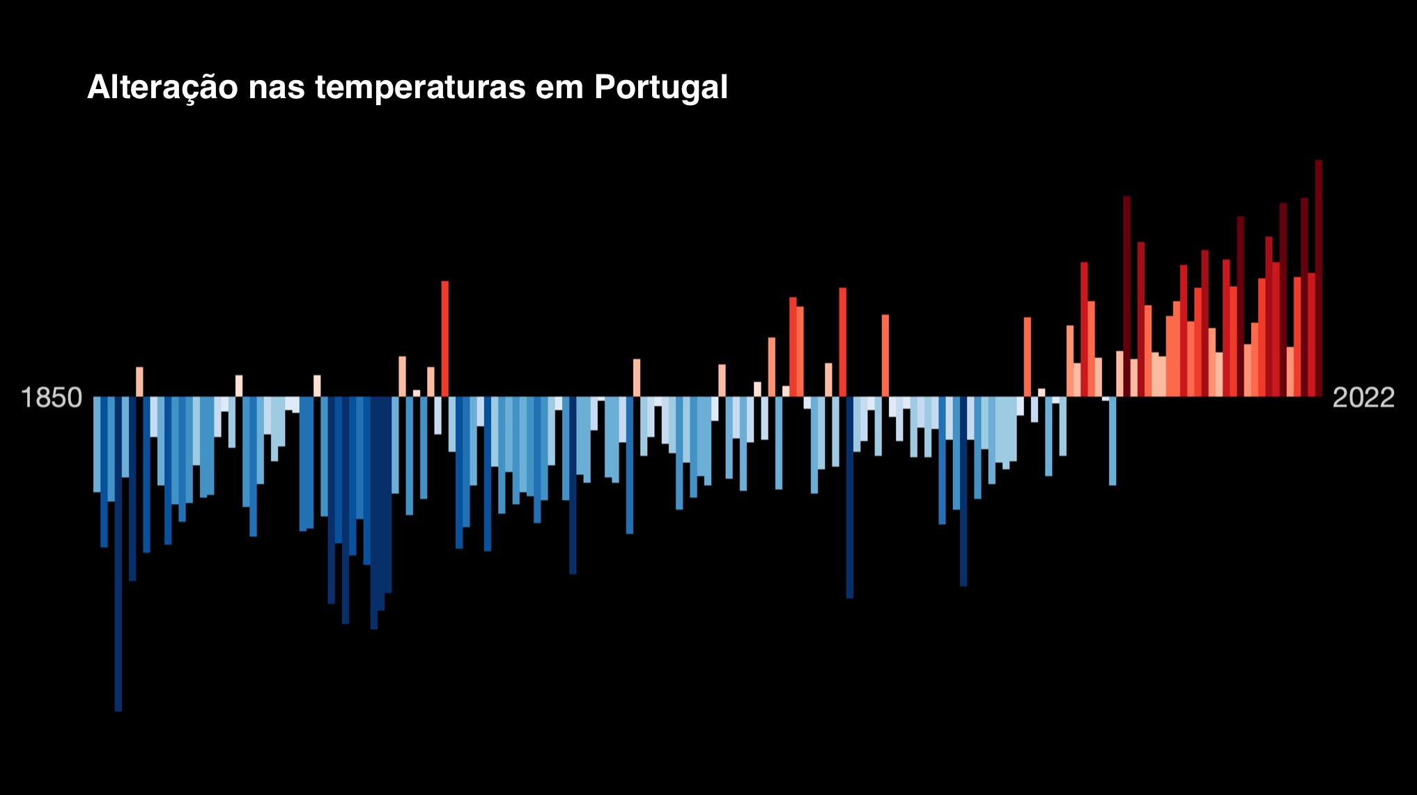 Gráfico da evolução das temperaturas em Portugal sob a influencia do aquecimento global, desde o início da era da revolução industrial, até 2022. Autor: Professor Ed Hawkins, #ShowYourStipes